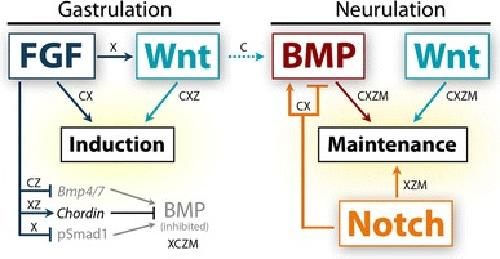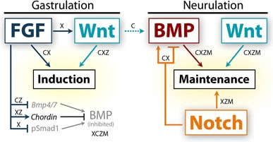 Fig. 5. A model of signaling participation during the two phases of neural crest induction. In this figure, we present a simplified model of the major signaling events thought to occur in NC induction, drawing on evidence from all four of the organisms discussed. Since the precise time, source, and cross-regulation between pathways vary between species, the model organism is noted where a specific interaction or activity is known to occur. XXenopus, C chick, Z zebrafish, M mouse. During gastrulation, FGF and Wnt signaling are both known to induce the neural crest at the prospective NPB, activating the expression of NPB specifiers. Xenopus studies demonstrate that FGF regulates Wnt signaling during this first phase, but evidence from chick and Xenopus suggests FGF acts directly as well. BMP signaling must be at least partially inhibited for this first step, and FGF participates in BMP attenuation on multiple levels. The transition to the second phase involves the activation of BMP signaling, and research on chick explants suggests Wnts may participate in this BMP activation. Since FGF contributes to BMP antagonism before and during gastrulation, the restriction of FGF activity or insensitivity of the NPB to FGF signals also likely plays a role in this transition. In the second phase, BMP and Wnt signaling converge to maintain the expression of NPB specifiers and initiate the expression of NC specifiers. Notch signaling is known to refine the domain of BMP activity, but some evidence suggests Notch acts directly on the neural crest population as well. Throughout later neural crest development, these signaling pathways continue to participate in migration and differentiation |