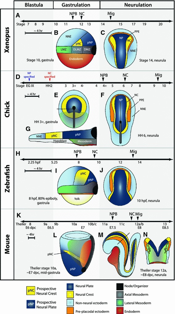Fig. 2. Timing and morphology of early neural crest development in Xenopus, chick, zebrafish, and mouse. a, d, h, k Timelines for early events in NC development. Note the appearance of neural plate border markers (NPB) and neural crest specifiers (NC) occurs during gastrulation in anamniotes (Xenopus and zebrafish) and after gastrulation in amniotes (chick and mouse). Anamniotes progress at a higher rate of development and the time between events is generally very short—compare sizes of ~4-h time bars. a In Xenopus, markers of the neural plate border are first apparent at Nieuwkoop and Faber stage 11.5 and immediately precede expression of neural crest specifiers at stage 12, before the end of gastrulation. NC migration (Mig) begins around stage 15. b Lateral view of early Xenopus gastrula. Animal pole is up, dorsal to the right. Prospective neural crest tissue (pNC) is found above the dorsolateral marginal zone (DLMZ), based on fate-mapping studies [31]. LMZ lateral marginal zone, DMZ dorsal marginal zone. c Dorsal view of a Xenopus neurula. Anterior is up. d In the chick, neural tissue is specified before the egg is laid at Eyal-Giladi (EG) stage IX, while neural crest tissue is specified by Hamburger and Hamilton (HH) stage 2. Markers of the neural plate border are not apparent until after gastrulation at stage 4+. The first neural crest specifiers are not expressed until stage 6. Migration begins between stage 9 and 10. e Dorsal view of mid-gastrula. Prospective neural crest tissue is found in a ring around the prospective neural plate (pNP) until post-gastrula stages when the anterior NPB is specified to become pre-placodal ectoderm [30]. f Lateral section through the dotted line in e. At pre-gastrula and early gastrula stages, the prospective neural crest is situated above the hypoblast, an extra-embryonic tissue. As mesoderm and endoderm ingress, the hypoblast is displaced anteriorly, and by the end of gastrulation prospective neural crest tissue is underlain by mesoderm. g Dorsal view of neurula, anterior is up. NC specifiers are initially only expressed in the anterior-most aspect of the neural folds. h In the zebrafish, neural plate border markers and neural crest specifiers are first expressed during gastrulation. Migration occurs after 13 h post-fertilization (hpf). i Lateral view of zebrafish gastrula. Animal pole is up, dorsal to the right. Location of prospective neural crest is inferred from expression of Msxb [70] and Pax3 [113]. j Dorsal view of neurula, anterior is up. k In the mouse, most neural plate border markers are first detectable around E7.5. Neural crest specifiers are expressed by E7.75, and NC cells begin migrating almost immediately after this expression. Listed below the timeline are approximate stages by Theiler stage, and embryonic days post coitum (dpc). l Lateral view of mouse gastrula. Anterior to the left. The mouse embryo develops with the prospective ectoderm as the interior layer. Location of the prospective neural crest is inferred from the position of prospective neural and non-neural tissues, and the expression of NPB markers by E7.5. m Lateral view of neurula. Anterior to the left. n Section through the dotted line in m. Although the neural tube has not yet closed, NC cells are migrating extensively |