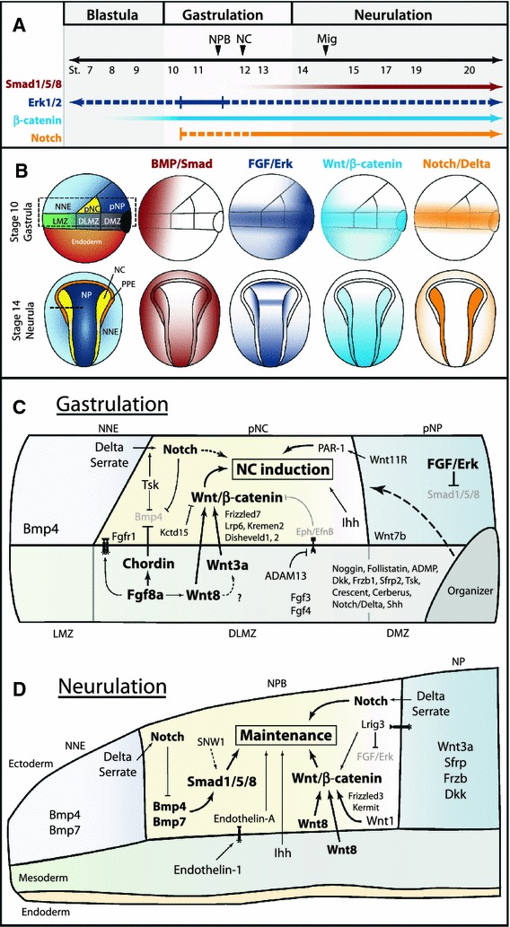 Fig. 4. Temporal and spatial participation of signaling pathways involved in chick neural crest induction. a Timeline of signaling pathway activation and requirement in early NC development. Closed arrows/lines indicate activation and requirement in NC tissues. Dotted lines indicate activation in NC tissues, but requirement is unknown. Smad1/5/8 signaling is active in the entire epiblast at blastula stages, but is inactivated by gastrulation [75]. Signaling becomes active with the expression of NPB markers, and remains active through to migration. Erk signaling is also active in most of the epiblast at blastula stages, and is required for neural induction until gastrulation. A requirement for FGF/Erk signaling in NC induction was only demonstrated during gastrulation. Erk signaling remains active in the NPB and NC tissues through to migration, but is no longer required for NC development (gray line). Wnt/β-catenin signaling is thought to be necessary for all stages of early NC development. A requirement for Notch/Delta signaling was demonstrated at mid-neurula stages. b Spatial activation of BMP, FGF, Wnt, and Notch signaling during chick gastrulation and neurulation. BMP/Smad activation based on [76]. FGF/Erk activation based on [76, 128]. Wnt/β-catenin activation inferred from expression of agonists and antagonists, and functional requirements for Wnt signaling. Notch/Delta activation is based on expression of molecules and functional requirements [154]. c Spatial expression of relevant signaling molecules and requirements for chick neural crest induction during gastrulation. Diagram corresponds to section at dotted line HH 3+ gastrula in b. Functional studies have demonstrated a requirement for FGF/Erk and Wnt/β-catenin signaling, but the participation of specific signaling molecules has not been challenged. The spatial expression of some potential signaling molecules is presented. Multiple FGF and Wnt agonists and BMP and Wnt antagonists are expressed in the node/primitive streak, but it is unclear whether these molecules can diffuse the distance to influence the prospective NC tissue (dotted arrow). d Spatial expression and participation of signaling molecules and pathways in the maintenance of NC progenitors during chick neurulation. Diagram corresponds to section at dotted line in HH 6 neurula in b. Smad1/5/8 and β-catenin are likely activated by Bmp4, Bmp7, Wnt1, and Wnt3a expressed in the neural folds and adjacent NNE. Wnt6 in the NNE has also been implicated in NC development, but may act through the non-canonical Rho/JNK pathway. Notch signaling likely participates indirectly by regulating Bmp4 expression. Spatial expression of other potential signaling molecules is presented. Expression data gathered from references in the text and from http://geisha.arizona.edu/geisha |