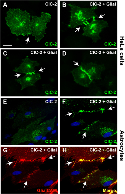 Figure 3. GlialCAM Changes the Subcellular Distribution of ClC-2 in HeLa Cells and in Primary Cultures of Astrocytes(A–D) GlialCAM changed the subcellular distribution of ClC-2 in transiently transfected HeLa cells from being at the plasma membrane when transfected alone (A) versus being at long cell-cell contact processes (B), at short cell-cell contact processes (C), or in extensive contact regions (D) when cotransfected with GlialCAM (arrows label cell-cell contacts). Scale bar: 10 μm.(E–H) Astrocytes were transduced with adenoviruses expressing ClC-2 alone or together with C terminally tagged GlialCAM at MOI 3. GlialCAM similarly brought ClC-2 to cell-cell contacts. Arrows point to astrocyte-astrocyte contacts. Immunofluorescence used a flag monoclonal antibody detecting GlialCAM protein (red) or a rabbit polyclonal antibody (C1) detecting ClC-2 (green). Colocalization between the red and the green fluorescence results in a yellow coloring (Merge). Nuclei of astrocytes were stained using DAPI (blue). Scale bar: 20 μm.See also Figure S3.