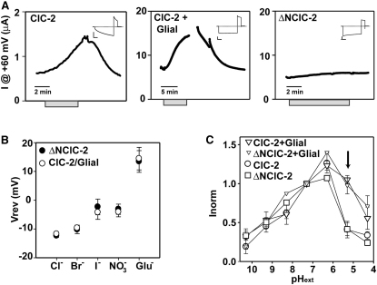 Figure 6. Electrophysiological Characterization of the GlialCAM/ClC-2 Complex(A) Dependence on the extracellular osmolarity of ClC-2, ClC-2 + GlialCAM, or ΔNClC-2 currents. Gray bars indicate application of the hypotonic solution. Insets show typical responses of the same oocytes to a pulse to −140 mV before swelling.(B) Reversal potential of ΔNClC-2 (n = 5 ± SEM) and ClC-2/GlialCAM (n = 5 ± SEM) currents under different anionic conditions.(C) pH dependence of ClC-2 and ΔNClC-2, each without and with GlialCAM. Currents were normalized to the value at pH 7.3. Arrow points to the pH value with the largest difference between the groups that express or not GlialCAM.See also Figure S5.