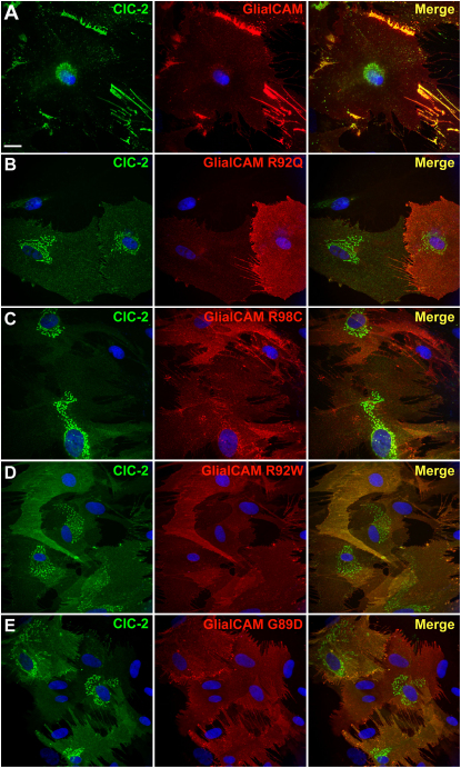 Figure 8. ClC-2 and GlialCAM Subcellular Localization Changes Caused by GLIALCAM Mutations in Primary Cultures of Astrocytes(A–E) Astrocytes were cotransduced with adenoviruses expressing ClC-2 together with wild-type GlialCAM (A) or containing the MLC-related mutations R92Q (B), R98C (C), R92W (D), and G89D (E). Cells were fixed, permeabilized, and then immunofluorescence was performed with a rabbit polyclonal antibody against ClC-2 (green) and a monoclonal antibody detecting GlialCAM protein (red). Nuclei were stained with DAPI (blue). Colocalization between the green and the red channel is shown in yellow. Images correspond to representative cells from three independent experiments. Scale bar: 20 μm.