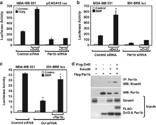 Figure 4. Dvl works as adaptor of Par1b/Smad4 complex. (aâc) Luciferase assays in MDA-MB-231 cells, showing that overexpression of Dvl3 is unable to stimulate Smad activity in cells depleted of Par1b (a and b). However, overexpression of Par1b can foster BMP-activity even in the absence of Dvl (c). Data are represented as mean and SD (*P<0.05 Student's t-test). (d) co-IP of overexpressed Par1b and Smad4 (pull down with anti-Par1b antibody) from transfected HEK293T cell lysates with and without co-transfected Dvl3. Co-transfection of Dvl3 enhances Par1b-Smad4 protein interaction |