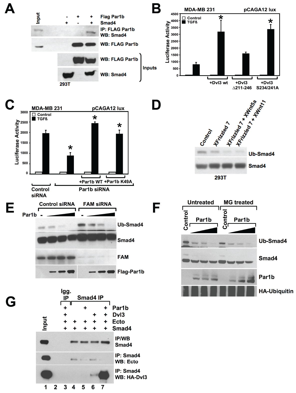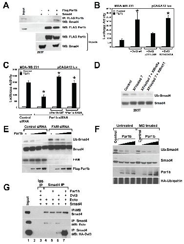 Figure S3 (A) CoIP of Smad4 in a complex with Par1b. Both proteins were overexpressed. See Fig.3C for association at physiological levels. (B) Luciferase assay for TGFβ in MDA-MB231 cells. The overexpression effects of wild-type Dvl3 are compared with those of two Dvl3 mutants: one that is unable to bind Par1b (5), and one that carries Serine-to-Alanine mutation of the two main Par1b phosphorylation sites (6). While the Par1b-binding domain is required for the effects of Dvl3, the phosphorylation sites are not. (C) Luciferase assay for TGFβ in MDA-MB231 cells for Par1b loss and rescue with wild-type Par1b or kinase-dead K49A Par1b. Kinase activity of Par1b is not required for its pro-TGFβ effects. Data are represented as mean and SD (D) Smad4 monoubiquitination assay as in Fig. 5A, showing the effect of co-transfected XFrizzled 7 and noncanonical Wnt ligands on Smad4 ubiquitination. (E) The inhibition of Smad4 monoubiquitination caused by Par1b overexpression is not affected by loss of FAM/USP9x. (F) Smad4 ubiquitination assays as is Figure 5A in cells also overexpressing Par1b. Par1b antagonize Smad4 monoubiquitination even in the presence of proteosome inhibitor MG132 (used at 10 μM for 10 hours) suggesting that Par1b does not enhance degradation of ubiquitinated Smad4. Effectiveness of MG132 treatment was monitored by p53 stabilization (data not shown). (G) In-vitro binding of Smad4 to Ecto is inhibited by Par1b alone or in combination with Dvl3. Flag-Smad4 protein (affinity purified) was incubated with Ecto in presence of either recombinant Par1b or HA-Dvl3 (affinity purified) or both. Panels are western blot of Ecto and Dvl3 bound to Smad4 after co-IP with Smad4 antibody. |