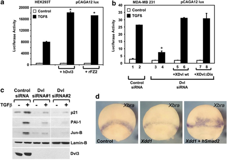 Figure 1. Dvl is relevant for TGFβ responses. (a) Graphs show the ligand-mediated inductions of the TGFβ reporter pCAGA12-lux in HEK293T cells. Raising the levels of Dvl with transfected human Dvl3, or of rFrizzled2 increases TGFβ transcriptional activity. See Supplementary Figures S1C and D for controls. (b) Treatment with TGFβ (0.03âng/ml) of MDA-MB-231 cells transfected with pCAGA12-lux and with control siRNA (lanes 1 and 2) or siRNA-targeting Dvl (lanes 3 and 4, siDvl#1,36 see Supplementary Table S1). Lanes 5â8 are specificity controls: adding back XDvl or XDvlδDix rescues TGFβ transcriptional activity. (c) Immunoblots for p21Waf1, JunB and PAI1 whose TGFβ induction in MDA-MB-231 cells is inhibited by two independent sets of Dvl siRNAs (Supplementary Table S1,36, 37). LaminB serves as loading controls. Cropped images come from the same exposure of the same blot from which other intervening lanes have been removed. (d) Panels show in situ hybridization of Xenopus embryos at the gastrula stage stained for the pan-mesodermal marker Xbra an in vivo read-out of TGFβ/Nodal signaling. Left panel: uninjected embryo; middle: downregulation of Xbra (n=39, 64%) in embryos injected at the four-cell stage with 2âng of Xdd1 mRNA in the marginal zone. Note that the width of the Xbra staining becomes restricted to a narrower band compared to control embryos. Right: rescue by co-injection of Xdd1 and Smad2 mRNAs (n=18, 67%). See Supplementary Figure S1J for similar requirement of Dvl for BMP responses. Throughout the panel, data are represented as mean and S.D. (*P<0.05 Student's t-test) |