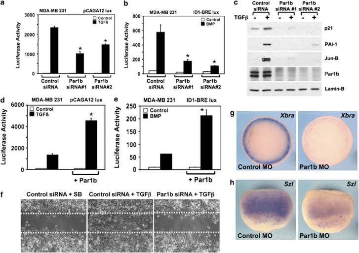 Figure 2. Par1b is relevant for TGFβ responses. (a and b) luciferase reporter assays stimulated by TGFβ (a) or BMP ligands (b) in MDA-MB-231 cells transfected with control or two independent Par1b siRNAs (Supplementary Table S1). Validation of effective knockdown of Par1b was carried prior to luciferase assays (data not shown). (c) Western blot analysis of endogenous TGFβ targets in control and Par1b-depleted MDA-MB-231 cells. (d and e) luciferase reporter assays stimulated by TGFβ (d) or BMP (e) ligands and by transfection of Par1b expression vector. (f) Wound-healing migration assay. Panels show representative pictures of MDA-MB-231 cells migrated into a scratch introduced in confluent monolayers. left: cells transfected with control siRNA and treated with the TGFβ receptor inhibitor SB431542; middle: migration after 48âh of TGFβ-treated cells; right: no effect of TGFβ in Par1b-depleted cells. Dots indicate the edges of the wound at the beginning of the experiment. Quantitations in Supplementary Figure S2C. Similar results were obtained with independent sets of Par1b siRNA. As control, transfection of Par1b siRNAs did not cause any reduction in cell proliferation, as measured by cell counting (data not shown). (g and h) Panels show in situ hybridization of Xenopus embryos injected with control and anti-Par1b MOs23 (a mix of 50âng of Par1 by MO plus 50âng Par1bx MO) and stained for the TGFβ target Xbra (n=20, 100%) (g) and the BMP-target Sizzled (n=21, 100%) (h), revealing an essential role for Par1b for these inductions. Throughout the panel, data are represented as mean and S.D. (*P<0.05 Student's t-test) |