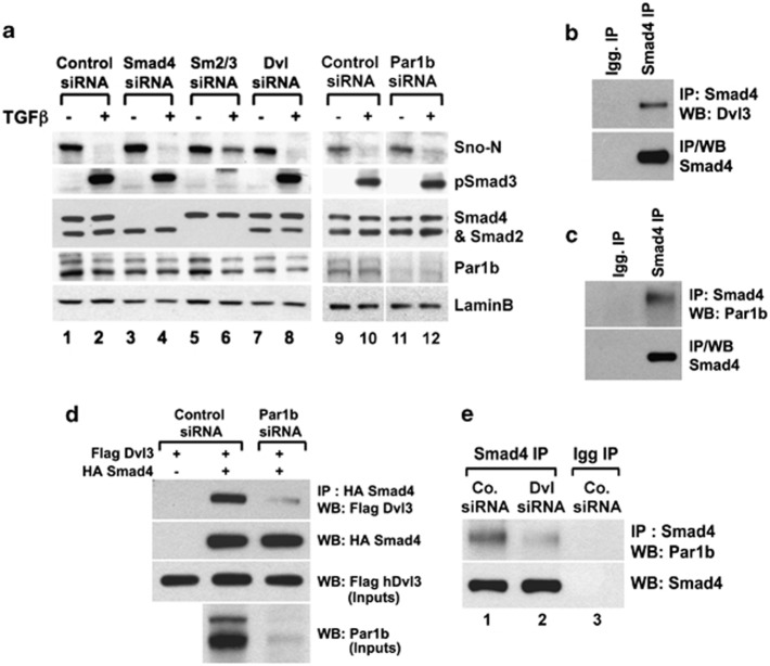 Figure 3. Dvl and Par1b associate with Smad4 in a mutually dependent manner. (a) Western blot analysis of lysates from cells transfected with the indicated siRNAs, monitoring Smad3 C-terminal phosphorylation downstream of receptor activation and SnoN degradation. The latter is mediated by association between P-Smad2/3 with SnoN in the nucleus, leading to degradation of SnoN independently from Smad4.6 (b and c) co-IP of Smad4 with Dvl3 (b) or Par1b (c) at endogenous protein levels, from HEK293T cell extracts; control IP was with unrelated Igg. (d) co-IP of Flag-Dvl3 with HA-Smad4 in control or Par1b-depleted HEK293T cells. Hereafter, inputs indicate immunoblots of lysates before co-IP, and serve as control for protein expression or depletion. (e) co-IP of endogenous Par1b and Smad4 proteins from control (lane 1) or Dvl-depleted HEK293T cells (lane 2); lane 3: IP control using an unrelated Igg |
