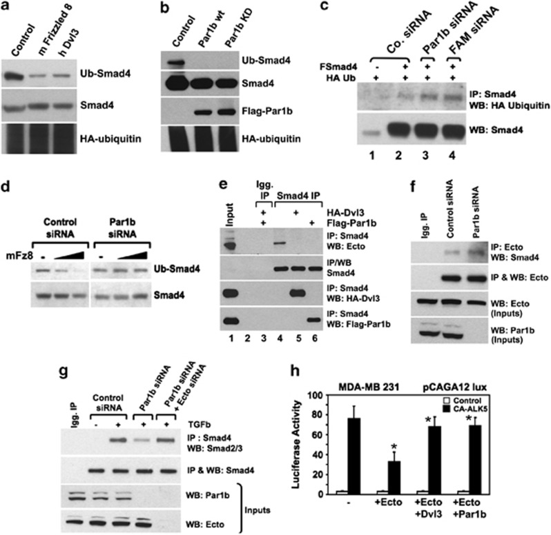 Figure 5. Dvl and Par1b regulate Smad4 monoubiquitination. (a) Western blot analysis detecting Smad4 monoubiquitination in lysates from HEK293T cells transfected with HA-ubiquitin, Flag-Smad4 and the indicated effectors of the Wnt pathway, that is, mFrizzled8 and hDvl3. Ub-Smad4 is a 75-kDa band reactive to the anti-Smad4 antibody (here shown) and to anti-HA (data not shown; see Dupont et al.6). (b) Western blot analysis of Smad4 monoubiquitination as in (a) comparing the activity of Par1b wild-type and kinase-dead K49A mutant (40âng DNA/cm2). (c) Anti-Smad4 immunoprecipitation and western blot analysis of lysates of MDA-MB-231 cell transfected with HA-ubiquitin, Flag-Smad4 and the indicated siRNAs. Validation of effective knockdown of Par1b and FAM was carried before ubiquitination assays (data not shown). (d) Smad4 monoubiquitination detected as in (a) in lysates from control and Par1b-depleted cells, transfected with two doses of mFz8 expression vector (5 and 10âng/cm2). (e) co-IPs for Smad4 from HEK293âT cells. Endogenous binding of Smad4 to Ecto is inhibited by overexpression of Dvl3 or Par1b. (f) co-IP of endogenous Smad4 and Ecto proteins is enhanced in HEK293T cells depleted of Par1b. (g) co-IP of Smad4 with Smad2/3, monitoring the formation of the active Smad complex, induced by TGFβ in HEK293T cells transfected with the indicated siRNAs. (h) Dvl and Par1b modulate Ecto activity. Graphs are luciferase reporter assays stimulated by transfection of constitutive-active-TGFβ receptor (CA-ALK5) in MDA-MB-231 cells in presence of the indicated expression constructs. Data are represented as mean and S.D. (*P<0.05 Student's t-test) |