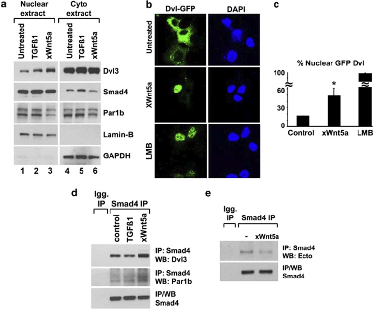 Figure 6. Wnt5a promotes nuclear Dvl/Par1b/Smad4 complex formation. (a) Monitoring endogenous Dvl3 and Par1b localization by nuclear-cytoplasmic fractionation of HEK293T cell lysates. The nuclear pool of Dvl3 was enhanced upon transfection of XWnt5a (100âng/cm2), whereas Par1b is distributed uniformly between the two compartments. LaminB and GAPDH serve as controls for nuclear and cytoplasmic fractionation. (b) Localization of Dvl-GFP (50âng/cm2) by fluorescence microscopy in HEK293T cells. Note that co-transfection XWnt5a (100âng/cm2) enhances nuclear localization of Dvl-GFP (green channel). Treatment with the nuclear export inhibitor leptomycinB was carried out at 50âng/ml for 4âh. Hoechst (blue channel) is a nuclear counterstain. (c) Quantification of cells displaying nuclear localization of Dvl-GFP shown in Figure 6b. Transfected cells were fixed and at least seven fields each containing 10â20 GFP-expressing cells were photographed and counted. LMB dramatically shifts Dvl localization into the nucleus (>95% of cells). Data represent mean and S.D. of two independent experiments. Percentage of nuclear positive Dvl-GFP cells. (d) Endogenous Smad4 interacts with Par1b and Dvl3 from nuclear fractions of HEK293T cells. Wnt5a stimulation increases these nuclear complexes. (e) Endogenous Smad4/Ecto complexes are inhibited in Wnt5a-stimulated HEK293T cells |