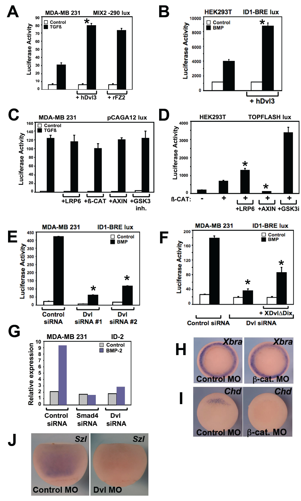 Figure S1 (A) Luciferase reporter assays using the Mix2-290 lux TGFβ reporter in MDA-MB-231 cells treated with TGFβ and transfected with hDvl3 or rFz2. At difference with the pCAGA12 lux, that respond only to Smad3/Smad4, the Mix2-290 promoter is sensitive to Smad2/Smad4. The reporter plasmid pMix2-290lux was always co-transfected with pCS2-myc-FAST1 (2:1 ratio). Data are represented as mean and SD. (B) Overexpression of hDvl3 enhances the induction of the ID1-BRE lux reporter by BMP in HEK293T cells. (C) Luciferase reporter assays using the pCAGA lux TGFβ reporter in MDA-MB-231 cells transfected with the indicated transducers of canonical Wnt signaling, showing no effect. (D) Positive control for the activity of selected transducers of canonical Wnt signaling on the TOP-flash reporter in HEK293T cells transfected with the indicated constructs. Data are represented as mean and SD. (E) Compendium of Fig. 1B; this panel shows that BMP-mediated induction of the ID1-BRE lux reporter is greatly attenuated in cells depleted of Dvl, as obtained by two independent siRNAs. Data are represented as mean and SD. (F) Compendium of Fig. 1B; Loss of Dvl i) limits BMP-mediated induction of the ID1-BRE lux reporter; ii) is rescued by cotransfected (and siRNA insensitive) DvlδDix. Data are represented as mean and SD. (G) Real time PCR analysis with reverse transcription showing relative expression levels of ID2 messenger RNA in MDA-MB-231 cells transfected with Smad4 siRNA and Dvl siRNAs, and treated with BMP2 (100 ng/ml for 2 hours) vs. dorsomorphin (a BMP receptor inhibitor). Induction of ID2 was attenuated upon Dvl depletion. (H and I) In situ hybridization for the markers Xbra and Chordin (Chd) in embryos injected at the 2-4 cell stage with β-catenin morpholino (n=23, 83% and n=15, 100% respectively). (J) Effect of Dvl2/3 depletion on Sizzled expression in embryos injected in the marginal zone radially at the 4 cell-stage with 25 ng of anti-Dvl2 and 25 ng of anti-Dvl3 morpholinos in each blastomere (n=34, 73%). For this experiment we used Dvl MO previously validated in Ref.(4) below. |