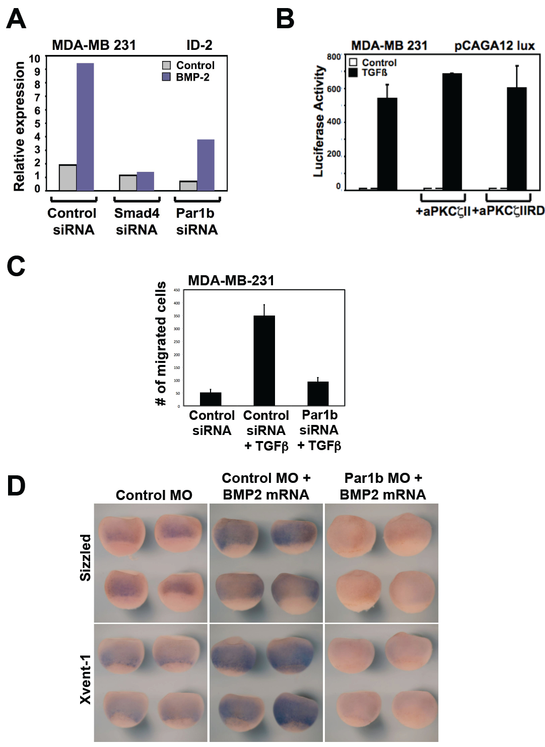 Figure S2 (A) Real time PCR analysis with reverse transcription showing relative expression levels of ID2 messenger RNA in MDA-MB-231 cells transfected with Smad4 siRNA and Par1b siRNA#1 and treated with BMP2 (100 ng/ml for 2 hours) versus dorsomorphin. Induction of ID2 was attenuated upon Par1b depletion. (B) TGFβ induces pCAGA12-lux and this is not affected by inactivation of aPKCζ as tested with two independent dominant negative constructs. aPKCζII is a natural dominant negative of aPKCζ; aPKCζIIRD is derived from a deletion of aPKCζII and is an even more potent inhibitor of aPKCζII (1). Data are represented as mean and SD. (C) Quantitation of the wound healing assay of Figure 2F. (D) Representative pictures of embryo stained by situ hybridization for the BMP targets Sizzled and XVent-1. Embryos were injected at the 2-4 cell stage with control morpholino or Par1b (x+y) MO (as in Figure 2G and 2H), with and without BMP2 mRNA. Similar results were obtained with anti-Dvl2/3 morpholinos (data not shown). |