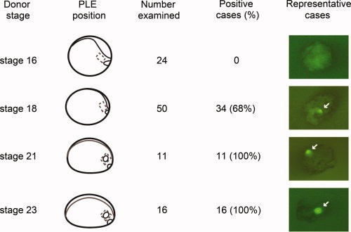 Figure 3. Lens-forming ability of PLE from different stage donors placed in the posterior of Stage 18 embryos. Transplants were made from donor embryos of the γ-crystallin-GFP transgenic line into wild-type hosts. Transplants were scored when hosts reached Stage 41. Diagrammatic views of the right sides of donor and host embryos are shown with boxes indicating the transplanted PLEs. The numbers of positive cases represent those which showed visible GFP driven by the γ-crystallin promoter. Reproduced with permission of the Publisher, John Wiley & Sons.