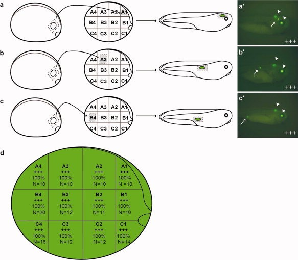 Figure 2. Assessment of developmental potential of specified PLE in transplant experiments. Panel a shows a diagram of 12 regions in the side of a Stage 18 embryo into which transplants were placed. b show examples of the different degrees of lens-forming ability in different sites indicated by the level of GFP fluorescence in responding ectoderm. PLEs from Stage 18 embryos were transplanted into different locations of embryos at the same stage. Host embryos were scored at Stage 41. A strong GFP signal (+++) was similar but still less than the level of endogenous gene expression and could be detected in the transplanted PLE when placed into region B1 as shown in panel b. A moderate response (++), clearly discernible, but much weaker than those responses in the anterior of the embryo, is illustrated in c'. Only a weak GFP signal (+) was seen in the transplanted PLE when placed into region C4 as shown in panel d'. Here, the response, though clearly positive, was just discernible. The images shown in this figure, and in other experiments, were photographed with the same exposure, and when transplanted into GFP-labeled hosts, as shown in this figure, more readily compared with host expression to determine relative levels. A summary of responses in all 12 regions is shown in e. In panels b', c', and d', arrows indicate the GFP fluorescence in the transplanted PLE and arrowheads indicate the endogenous GFP in hindbrain and lens of the transgenic embryos. Reproduced with permission of the Publisher, John Wiley & Sons.