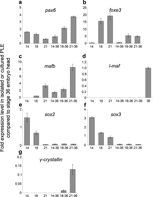 Figure 6. A comparison of expression levels of lens genes in cultured Stages 14, 18, and 21 PLE. The fold number of gene expression in each group of explants was obtained by comparison of the gene expression level in explants to that in Stage 36 head tissue. All expression levels were normalized to 28S rRNA levels in a given tissue. Expression levels of pax6 (a), foxe3 (b), mafb (c), l-maf (d), sox2 (e), sox3 (f), and γ-crystallin (g) in each group of samples is illustrated. The gene expression level of noncultured Stage 14, Stage 18, and Stage 21 PLE represents the endogenous gene expression in PLE at each corresponding stage. 4 to 36denotes PLE explants excised at Stage 14 and cultured to Stage 36. 8 to 36denotes PLE explants excised at Stage 18 and cultured to Stage 36. 1 to 36denotes PLE explants excised at Stage 21 and cultured to Stage 36. Error bars are standard deviations generated from three independent experiments. Reproduced with permission of the Publisher, John Wiley & Sons.