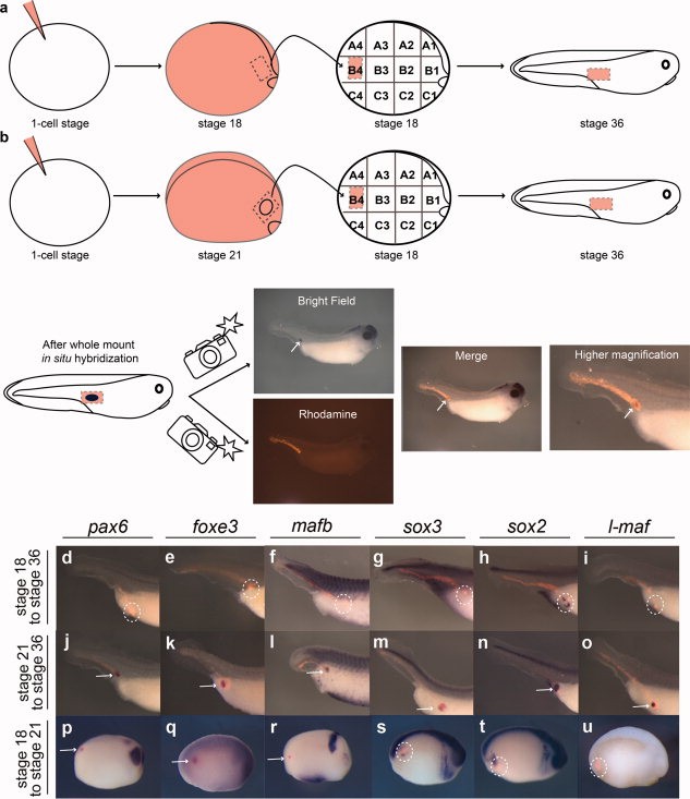Figure 5. The transition from lens specification to lens determination is tissue autonomous. Panel a shows the procedure used in this experiment, i.e., PLEs from Stage 18 γ-crystallin-GFP3 embryos were removed and cultured alone until the donor embryos reached Stage 21. Then, aged PLE was transplanted into region B4 (b), a posterior region of a Stage 18 host embryo or into region C3 (c), a ventral region. Host embryos were scored at Stage 41. Strong GFP expression could be observed in the transplanted PLE in both regions. In panels b' and c', arrows indicate GFP in the transplanted PLE and arrowheads indicate the endogenous GFP in transgenic host embryos. Reproduced with permission of the Publisher, John Wiley & Sons.