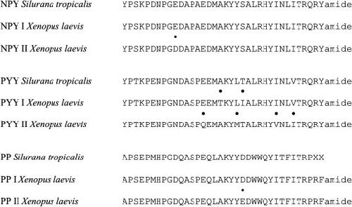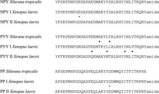 Alignment of the three NPY-family peptide sequences in S. tropicalis with sequences from the African clawed frog Xenopus laevis [18]; [23] ; [46]. Dots mark residues that differ from the top sequence in each of the three panels. The last two amino acids of pancreatic polypeptide and the glycine forming the carboxyterminal amide could not be predicted because they are encoded on a separate exon that could not be found in the S. tropicalis genome database. We therefore synthesized this peptide to end with RFamide as in PP reported for Xenopus laevis and other frogs.