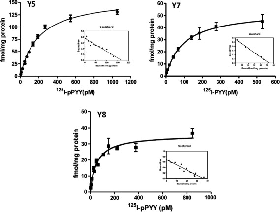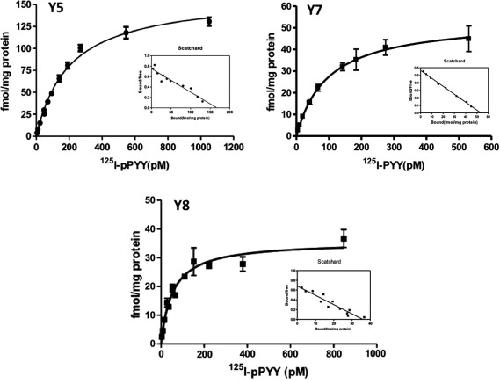 Saturation and Scatchard (inset) analyses of 125I-pPYY binding to the Y5, Y7 and Y8 receptors. Results shown are from one representative experiment (for a summary of all binding experiments see Table 1).