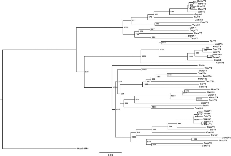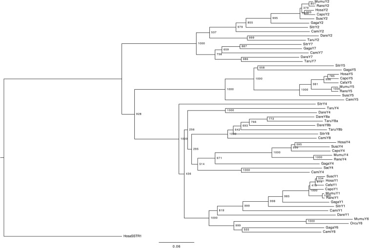 Maximum Likelihood (ML) phylogenetic tree with 100 bootstrap replicates showing the NPY-receptor family. The genes described in this study are marked with a dot. The tree is rooted with human somatostatin receptor 1. Species abbreviations are: Sitr, S. tropicalis; Hosa, Homo sapiens; Cafa, Canis familiaris; Susc, Sus scrofa; Capo, Cavia porcellus; Rano, Rattus norvegicus; Mumu, Mus musculus; Gaga, Gallus gallus; Cami, Callorhinchus milii; Sac, Squalus acanthias; Dare, Danio rerio; Orcu, Oryctolagus cuniculus; and Taru, Takifugu rubripes. A neighbor-joining tree is available in Supplementary Fig. 1.