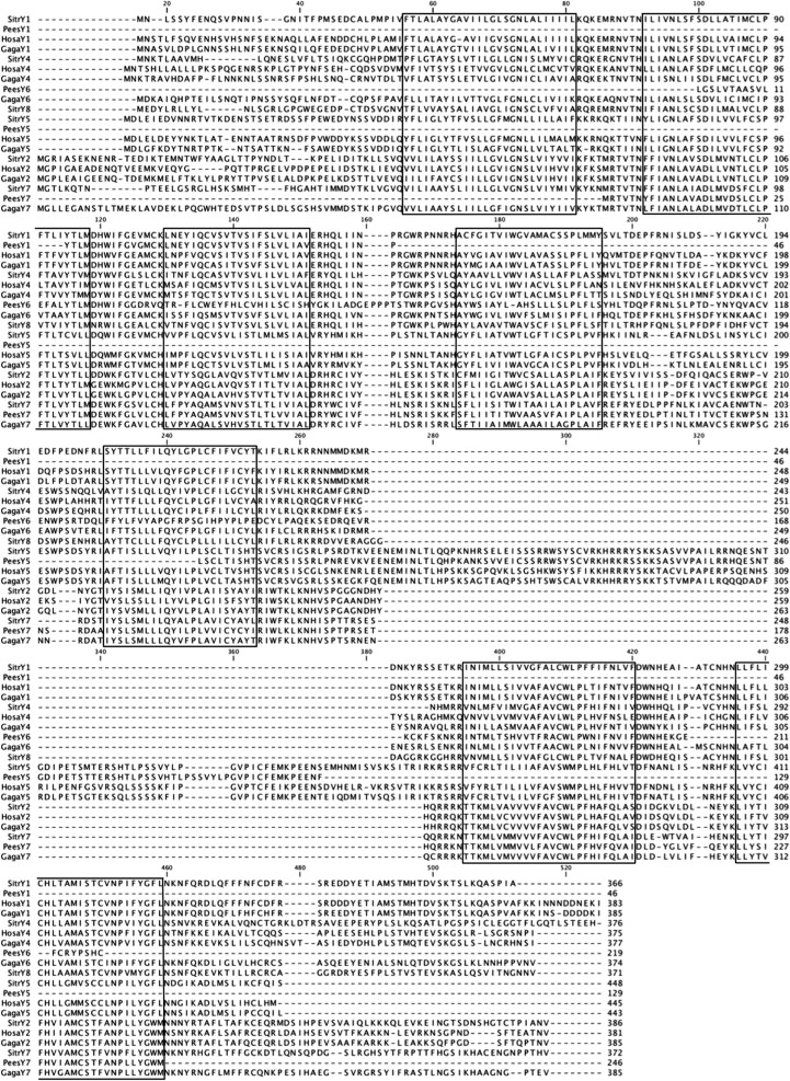 Amino acid alignment of NPY-receptor sequences from Western clawed frog, S. tropicalis (Sitr); the frog Pelophylax esculentus (Pees); chicken, Gallus gallus (Gaga); and human, Homo sapiens (Hosa). Boxes mark the predicted transmembrane (TM) regions.