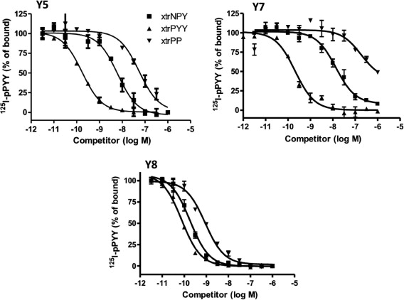 Competition assays performed for Y5, Y7 and Y8 receptors using native NPY, PYY and PP and 125I-pPYY as radioligand. Results shown are from one typical experiment for each receptor (for a summary of all binding experiments see Table 1).