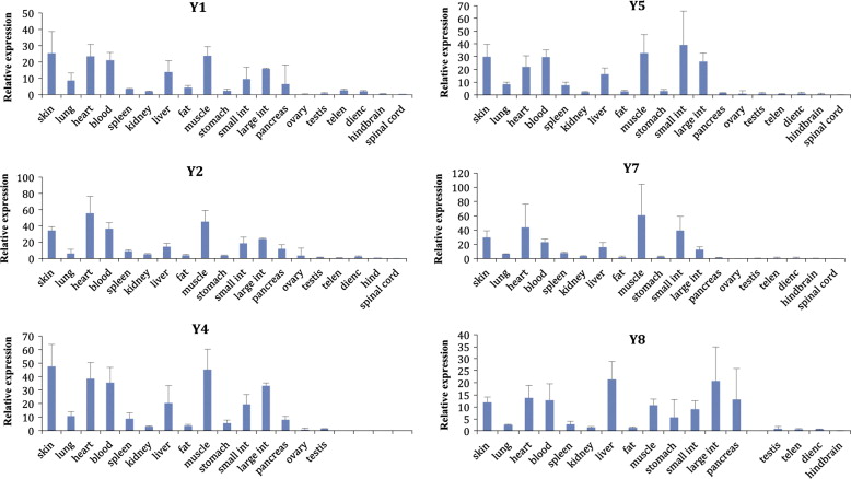 Expression data for NPY-family receptors in a panel of 19 S. tropicalis organs. Error bars show standard error of the mean. Normalized Ct values were used to calculate the relative expression values. For each transcript the tissue with the lowest expression was used to calculate relative expression. For the different genes, the following tissues had lowest expression: Y1, ovary; Y2, spinal cord; Y4, ovary; Y5, spinal cord; Y7, egg; and Y8, hindbrain. The analysis was performed twice, each time with duplicate samples.