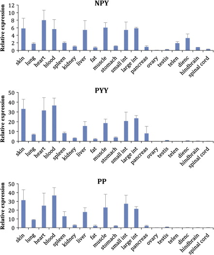 Expression data for NPY-family peptides NPY, PYY and PP in a panel of 19 S. tropicalis organs. Error bars show standard error of the mean. Normalized Ct values were used to calculate the relative expression values. For each transcript the tissue with the lowest expression was used to calculate relative expression. For the different genes, the following tissues had lowest expression: NPY, ovary; PYY, telencephalon; and PP, ovary. The analysis was performed twice, each time with duplicate samples.