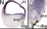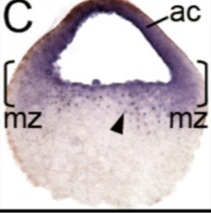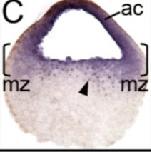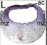 ezh2 (enhancer of zeste 2 polycomb repressive complex 2 subunit ) gene expression in bissected Xenopus tropicalis embryo, NF stage 10.25, as assayed by in situ hybridization, dorsal right.