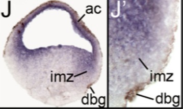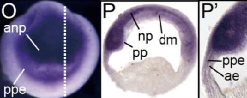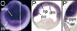 kdm6b (lysine (K)-specific demethylase 6B) gene expression in Xenopus tropicalis embryo, assayed via in situ hybridization, NF stage 17, anterior view, dorsal up (O) and sagittal/median section, dorsal up (P and P').