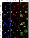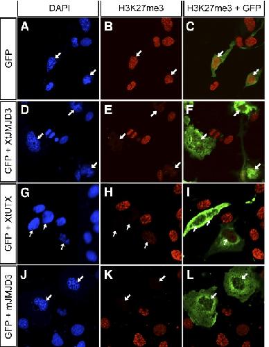 Fig. 2. Overexpression of XtJMJD3 or XtUTX reduced H3K27me3 levels in cell culture. COS-7 cells were transfected with an empty expression vector, pCS2+ (A-C), an XtJMJD3 expression vector, pCS2+xtjmjd3 (D- F), an XtUTX expression vector, pCMVSPORT6-xtutx (G-I), or a mouse JMJD3 expression vector, pCS2+mJmjd3 (J-L). A GFP expression vector, pCAGGS-GFP, was co-transfected in each case to identify the transfected cells. The blue, red and green are nuclear DAPI staining, anti-H3K27me3 antibody staining and anti-GFP antibody staining, respectively. White ar- rows indicate nuclei of transfected cells.