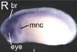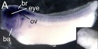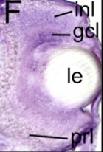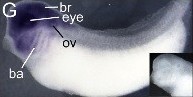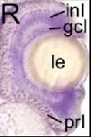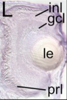 ov, otic vesicle; ba, branchial arch; mc, mesencephalon; dc, diencephalon; oc, optic cup; le, lens; mnc, migrating neural crest; rc, rhombencephalon; nc, notochord; sc, spinal cord; gcl, ganglion cell layer; inl, inner nuclear layer; prl, photoreceptor layer.