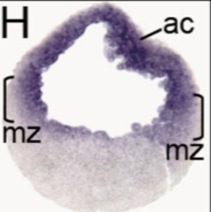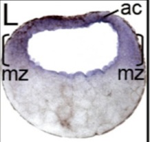 ezh2 (enhancer of zeste 2 polycomb repressive complex 2 subunit ) gene expression in bissected Xenopus tropicalis embryo, NF stage 8, as assayed by in situ hybridization, dorsal right.
