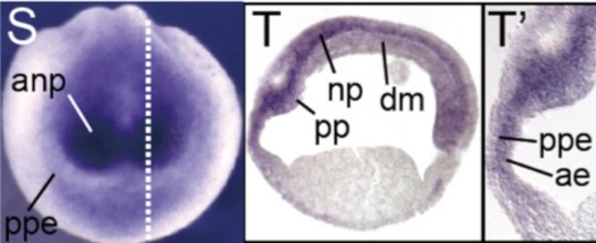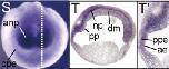 kdm6a (lysine (K)-specific demethylase 6A) gene expression in Xenopus tropicalis embryo, assayed via in situ hybridization, NF stage 17, anterior view, dorsal up (S) and sagittal/median section, dorsal up (T and T').
