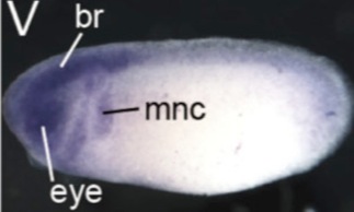 ezh2 (enhancer of zeste 2 polycomb repressive complex 2 subunit ) gene expression in Xenopus tropicalis embryo, assayed via in situ hybridization, NF stage 25, lateral view, anterior left, dorsal up.