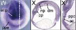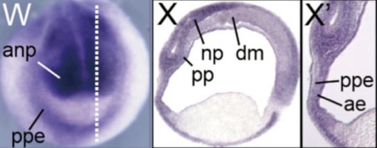 ezh2 (enhancer of zeste 2 polycomb repressive complex 2 subunit ) gene expression in Xenopus tropicalis embryo, assayed via in situ hybridization, NF stage 17, anterior view, dorsal up (W) and sagittal/median section, dorsal up (X and X').