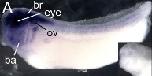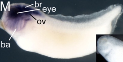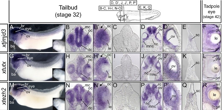 Fig. 4. Expression of xtjmjd3, xtutx and xtezh2 in tailbud embryos and tadpoles. (A,G,M) Lateral views of tailbud embryos subjected to whole-mount in situ hybridiza- tion. Insets show embryos hybridized with a sense probe for xtjmjd3, xtutx or xtezh2. (B-E,H-K,N-Q) Transverse sections sub- jected to in situ hybridization. The planes of the sections are illustrated in the top white box. (BHN High magnification views of eyes in the transverse sections shown in B, H, and N. Arrows indicate the outer layer of the optic cup. (C,I,O) Transverse sections hybridized with a sense probe for xtjmjd3, xtutx or xtezh2. (DJP High magnification views of otic placodes in the transverse sections shown in D, J and P. (F,L,R) Transverse sections of tadpole eyes subjected to in situ hybridization. br, brain;
