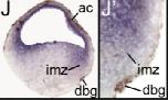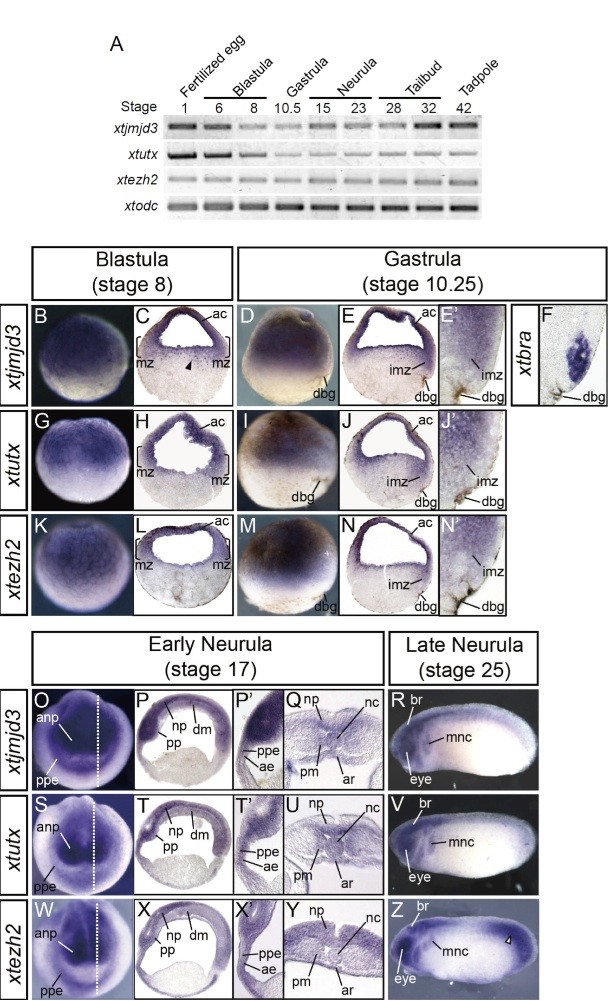 Fig. 3. Developmental expression of xtjmjd3, xtutx and xtezh2. (A)Temporal expression was analyzed in whole embryos by RT-PCR at indicated stages. xtodc was used as a loading control (Sindelka et al., 2006). (B-Z) In situ hybridization analysis of blastula, gastrula and neurula embryos. (B,C,G,H,K,L) Expression at the blastula stage. Lateral views of the whole embryos (B,G,K), and their sections are shown (C,H,L). The animal pole is at the top. A black triangle in C indicates dotted expression of xtjmjd3intheupperpartofthevegetalregion.(D-EI-JM-N Expression at the gastrula stage. Lateral views of the whole embryos (D,I,M), sections (E,J,N), and high magnification views of the sections focusing on the involuting marginal zone (EJN are shown. The animal pole is at the top, and dorsal is to the right.The expression of the X. tropicalis brachyury gene (xtbra) was also examined for comparison with xtjmjd3 (F), since Jmjd3 is involved in the regulation of brachyury in mouse ES cells (see Discussion). (O-Q,S-U,W-Y) Expression at the early neurula stage. (O,S,W) Frontal views. White broken lines indicate the planes of the parasagittal sections shown in P, T and X. (PTX High magnification views of the parasaggital sections in the anterior region. (Q,U,Y) Transverse sections of the dorsal part of the embryos. (R,V,Z) Expression at the late neurula stage. Lateral views of whole embryos are shown. A white triangle indicates posterior expression of xtezh2. ac, animal cap; mz, marginal zone; dbg, dorsal blastoporal groove; anp, anterior neural plate; ppe, preplacodal ectoderm; np, neural plate; pp, precaudal plate; dm, dorsal mesoderm; ae, anterior endoderm; nc, notochord; pm, paraxial mesoderm; ar, archenteron roof; br, brain; mnc, migrating neural crest.
