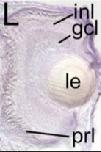 kdm6b (lysine (K)-specific demethylase 6B) gene expression in Xenopus tropicalis embryo, assayed via in situ hybridization, NF stage 42, retinal section.