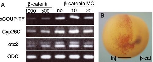 Fig. 3. Brain marker expression in xCOUP-TF-B-inject- ed embryo. (A) RT-PCR analysis with cDNA derived from the anterior half of stage-13 embryo injected with 1000 pg (lane1) or 500 pg (lane 2) of bcatenin mRNA, and 10 ng (lane 4) or 20 ng (lane 5) of bcat MO. (B) Whole-mount in situ hybridization with b-catenin-injected embryo. For tracing the injected area, lacZ mRNA was co-injected and injected embryos were stained with Red-Gal.