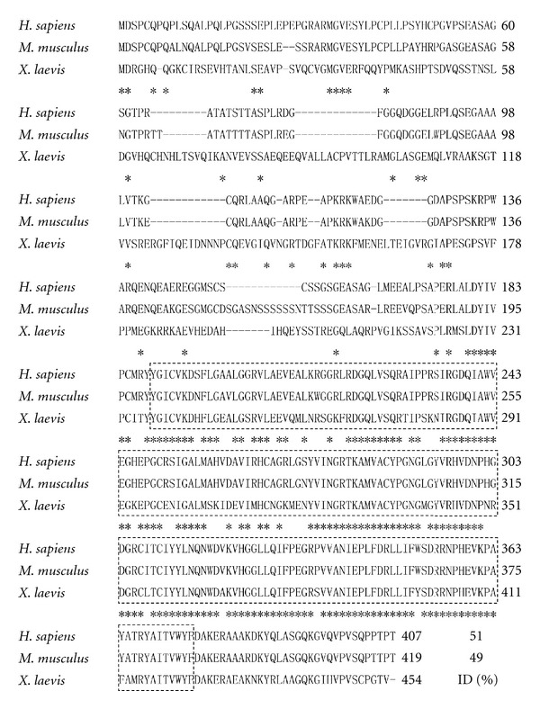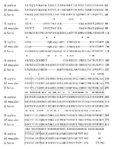 Figure 1. Predicted primary sequence of Xenopus phd1 in comparison with human and mouse Phd1. Stars indicate identical amino acids in all three species. Hyphens represent gaps introduced for optimizing the alignment. Dashed rectangles demarcate the highly conserved prolyl 4 hydroxylase domain. ID stands for the percentage of amino acid identity of Xenopus laevis phd1 in comparison with human and mouse Phd1.