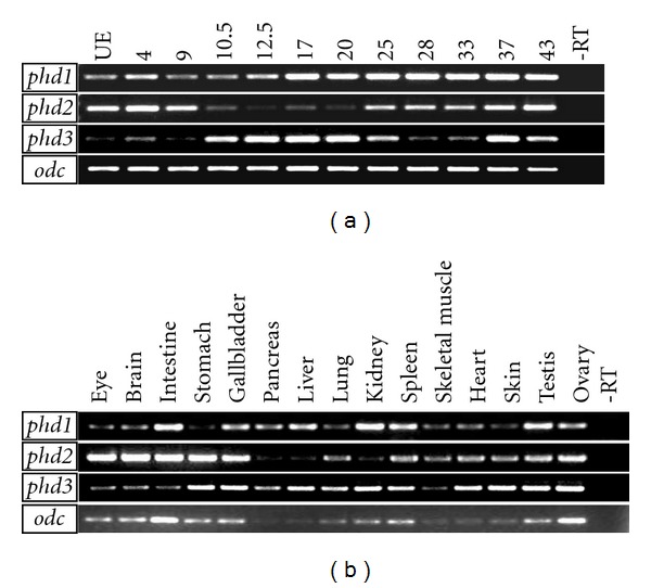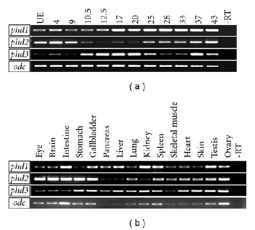 Figure 4. Temporal expression profile and adult tissue expression patterns of phd1, 2, and 3 revealed by RT-PCR analyses. (a) Temporal expression profile of phd1, 2, and 3 in Xenopus embryos. (b) Expression of phds in Xenopus adult tissues. odc was employed as a loading control. UE: unfertilized eggs.