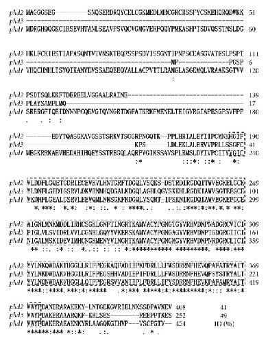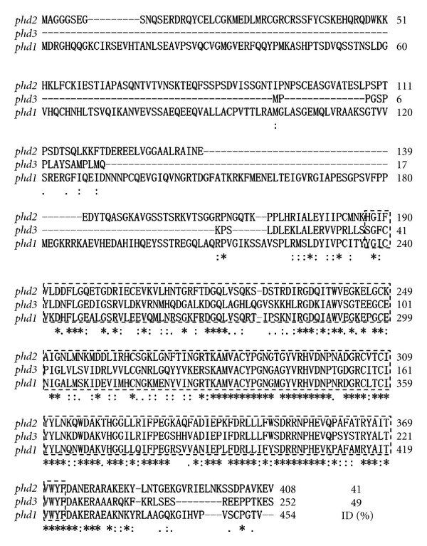 Figure 2. Comparison of the amino acid sequences of three Xenopus phds. Stars indicate identical amino acids in all three phds. Hyphens represent gaps introduced for optimizing the alignment. Dashed rectangles demarcate the highly conserved prolyl 4 hydroxylase domain. ID stands for the percentage of amino acid identity of Xenopus laevis phd1 in comparison with Xenopus phd2 and phd3.