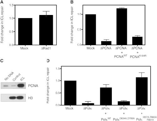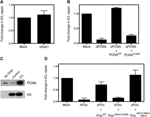 (B) Quantification of ICL repair in mock-depleted HSS, PCNA-depleted HSS, and PCNA-depleted HSS supplemented with PCNAWT or PCNAK164R.