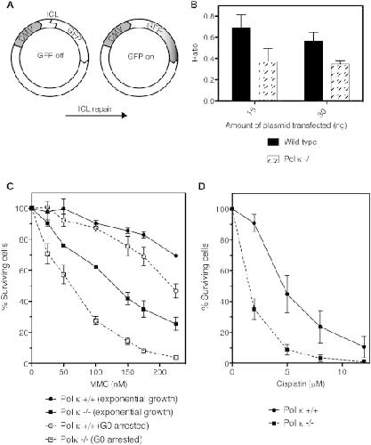 (D) Clonogenic survival assay with Pol κ−/− or Pol κ+/+ MEFs in the presence of the indicated concentration of cisplatin during exponential growth. Results represent the mean and SEM from at least three independent experiments.