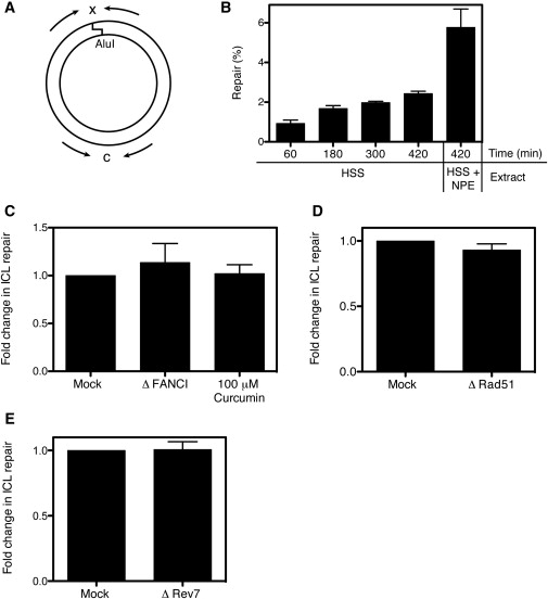 (C) Quantification of ICL repair in mock- and FANCI-depleted HSS or in HSS treated with 100 μM curcumin.