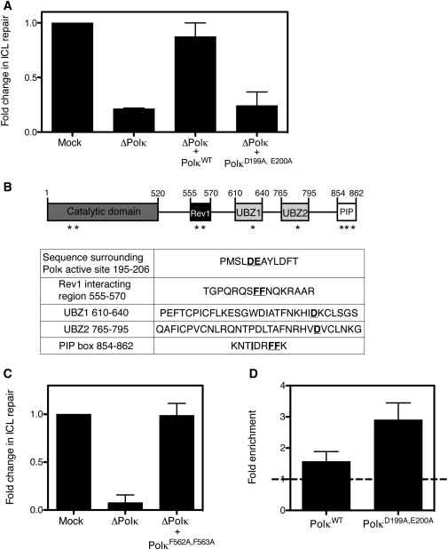 (D) ICL and control plasmids were incubated in Pol κ-depleted HSS, supplemented with either Pol κWT or Pol κD199A, E200A and anaylzed by Pol κ ChIP. The data are expressed as the fold enrichment of DNA pulled down from ICL plasmid compared to control plasmid. A value of 1 (dashed line) indicates no enrichment. Results represent the mean and SEM from at least three independent experiments.