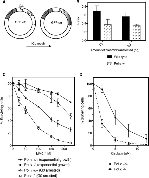 (B) Quantification of the repair of a single site-specific ICL in either Pol κ−/− or Pol κ+/+ MEFs using the GFP-based assay shown in (A). Repair is expressed as the fraction of GFP-positive cells transfected with the ICL plasmid over GFP-positive cells transfected with the control plasmid.