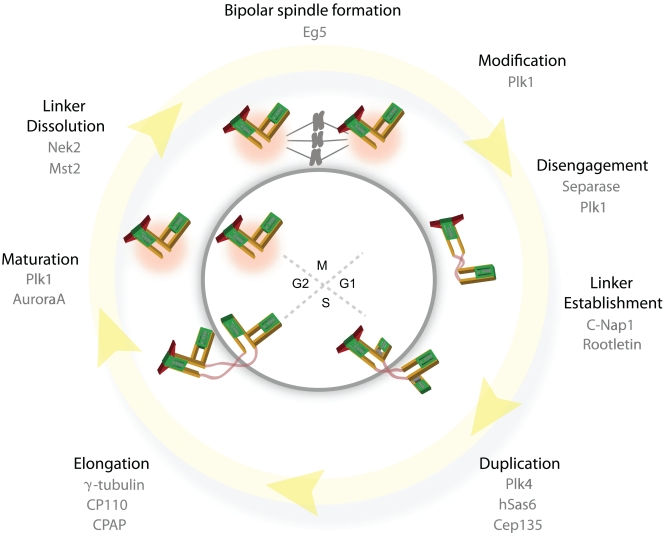 The centrosome, which consists of two centrioles and the surrounding pericentriolar material, is the primary microtubule-organizing center (MTOC) in animal cells. Like chromosomes, centrosomes duplicate once per cell cycle and defects that lead to abnormalities in the number of centrosomes result in genomic instability, a hallmark of most cancer cells. Increasing evidence suggests that the separation of the two centrioles (disengagement) is required for centrosome duplication. After centriole disengagement, a proteinaceous linker is established that still connects the two centrioles. In G2, this linker is resolved (centrosome separation), thereby allowing the centrosomes to separate and form the poles of the bipolar spindle. Recent work has identified new players that regulate these two processes and revealed unexpected mechanisms controlling the centrosome cycle.
