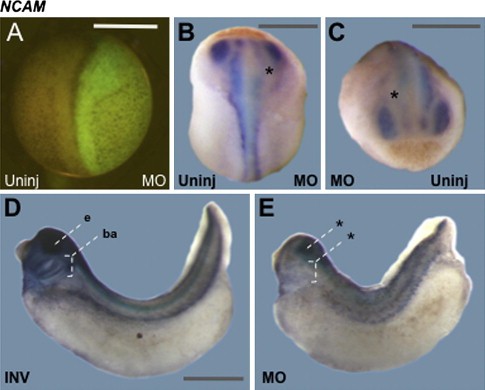 Fig. 2 â WSTF function is required for neural tissue formation in vivo. A: Two-cell stage embryos (dorsal view, anterior at top) were injected with carboxyï¬uorescein-labeled WSTF MO unilaterally into a single blastomere; ï¬uorescence indicates the injected side. B-C: NCAM expression analyzed by whole mount in situ hybridization at late neurulation (stage 21; B: dorsal view, anterior at top; C: anterior view, dorsal at top). NCAM is normally expressed in the eyes and neural ectoderm. NCAM signal is diminished in the anterior on the WSTF MO-injected side. Asterisk denotes region of greatest loss of NCAM signal. C: Anterior view of embryo in (B), highlighting anterior reduction of NCAM expression in the eye rudiments and neural ectoderm on the injected side. Asterisk denotes loss of NCAM signal. D-E: NCAM expression analyzed by whole mount in situ hybridization at late tailbud stage (stage 35; side views, anterior to left). D: One-cell stage embryos were injected with WSTF-inverse MO (INV) and display normal NCAM expression in neural ectoderm, eye (e) and branchial arches (ba). E: One-cell stage embryos injected with WSTF MO (MO) display reduced NCAM expression at late tailbud stage. Bracket marked by asterisk indicates loss of NCAM staining in branchial arches in WSTF-MO injected embryos (E). Scale bars: 0.5 mm (AâC) and 1 mm (D and E).