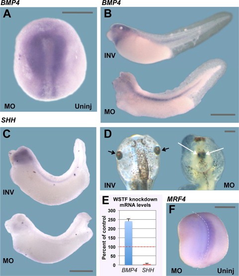Fig. 3 â SHH, BMP4 and MRF4 are misexpressed in WSTF knockdown embryos. A: BMP4 expression in the neural plate analyzed by whole mount in situ hybridization at late neurulation (stage 17; dorsal view, anterior at top) in embryos injected with WSTF morpholino at the two-cell stage. BMP4 expression is expanded beyond its normal domain on the WSTF knockdown side (left) compared to the uninjected control side (right). B: Whole mount in situ hybridization displaying normal expression pattern of BMP4 compared to global WSTF knockdown embryos at late tailbud stage (stage 40; side view, anterior to left). One-cell stage embryos were injected with either WSTF MO (bottom) or WSTF-inverse MO (INV, top). Inverse MO globally injected embryos display normal BMP4 expression in the hindbrain, developing heart, and faintly in the otic vesicle. Global WSTF knockdowns display decreased BMP4anterior expression as well as aberrant expression in dorsal tissues. C: Whole mount in situ hybridization displaying normal expression of pattern SHH compared to global WSTF knockdowns at late tailbud stage (stage 36â37; side view, anterior to left). One-cell stage embryos were injected with either WSTF MO (bottom) or WSTF-inverse MO (top). Globally injected inverse MO embryos display SHH expression in the head and notochord. Global WSTF knockdown embryos display decreased SHH expression throughout. D: Global WSTF knockdown embryo (right) displaying cyclopia/holoprosencephaly compared to globally injected inverse MO embryo (left) at stage 45 (dorsal views of heads, anterior at top). Arrows indicate location of eye(s). One-cell stage embryos were injected with either WSTF MO or WSTF-inverse MO. E: Real time RTPCR results for BMP4 and SHH graphed as a percentage of normal expression. BMP4 (stage 37) is signiï¬cantly over-expressed and SHH expression (stage 15) is signiï¬cantly reduced in WSTF knockdown embryos injected at the one-cell stage. Data are the average of 3â4 independent experiments and standard errors are shown. F: MRF4 expression in a stage 15 embryo (dorsal view, anterior at top) injected with WSTF MO at the two-cell stage. The injected side (left) displays a signiï¬cant decrease in normal MRF4 expression in the developing somites. Scale bars: 0.5 mm (A and F) and 1 mm (BâD).
