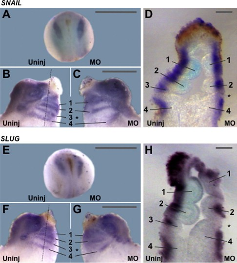 Fig. 5 â WSTF knockdown embryos display proper neural crest induction, but fail to maintain normal neural crest in later development. AâH: Two-cell stage embryos were injected with WSTF MO unilaterally into a single blastomere and analyzed by whole mount in situ hybridization at neural groove stage (stage 15) to display expression pattern of neural crest genes SNAIL and SLUG. Both genes are expressed at the neural crest boundary. WSTF knockdown has no effect on the stage 15 expression of neural crest genes SNAIL (A) and SLUG (E) (dorsal views, anterior at top). Identically treated embryos analyzed by whole mount in situ hybridization at tailbud stage (stage 30; side views of heads, anterior at top) display perturbed expression of neural crest genes SNAIL (B and C) and SLUG (F and G) on the WSTF-knockdown side (C and G). 60-lm sections through the branchial arches of unilateral WSTF knockdown embryos (anterior at top) display diminished expression of SNAIL (D) and SLUG (H) on the injected side, particularly in the internal structures (light blue staining). Arches are labeled in BâD and FâH. Asterisks indicate the relative position of missing/fused arch number 3 on the sides derived from the WSTF MOinjected blastomeres. Dashed lines in B and F indicate the plane of sectioning of D and H, respectively. Scale bars: 1 mm (A, E), 0.5 mm (B, C, F, G) and 0.1 mm (D, H).
